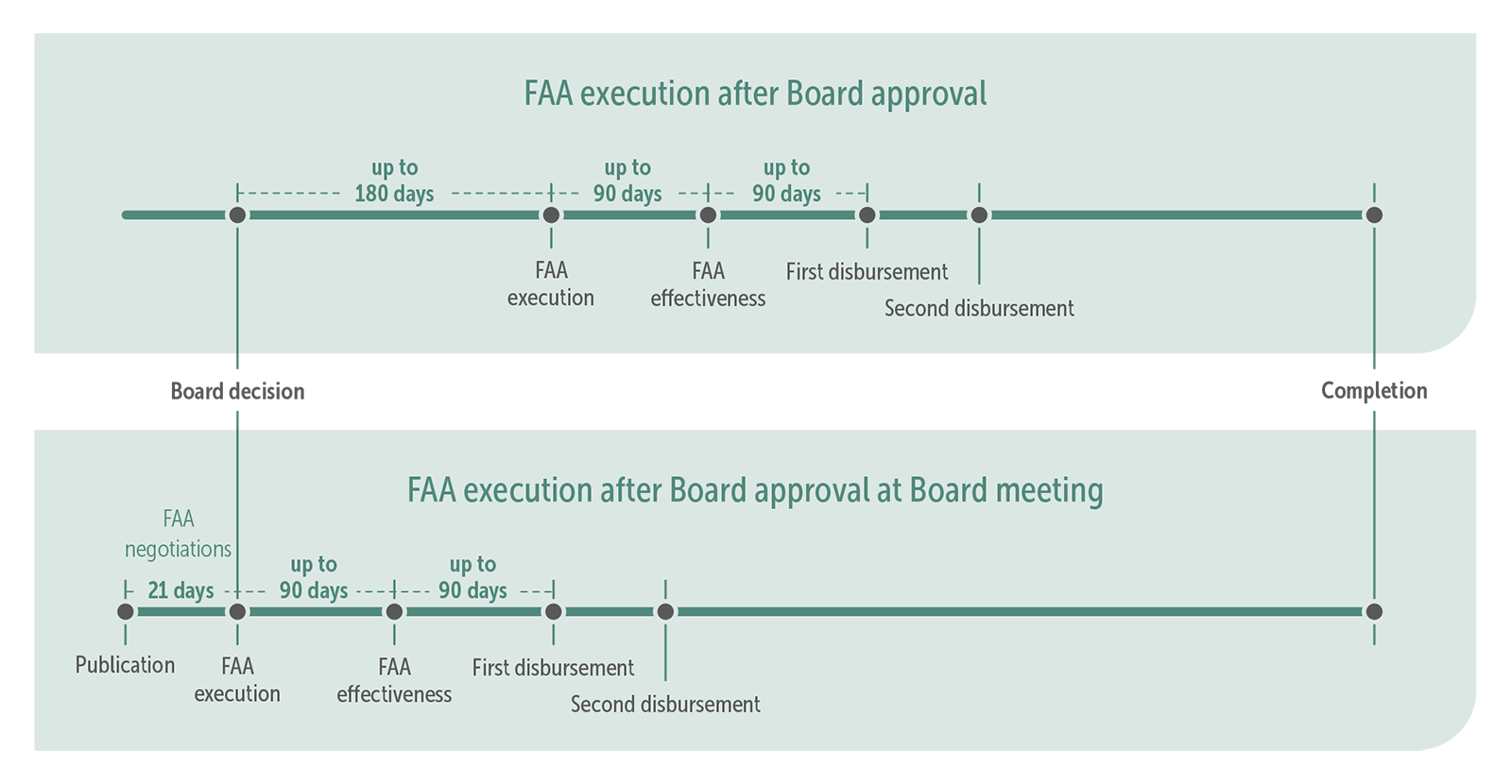 Following FP approval, the Secretariat prepares the first draft of the FAA and sends it to the AE to start the negotiation process. In some cases, a negotiations may start prior to the FP approval as long as key prerequisites are met, such as, where applicable, an effective Accreditation Master Agreement (AMA), and delivery by the AE of a certificate of internal AE approval. Furthermore, there should not be any outstanding project-specific conditions precedent to FAA execution.