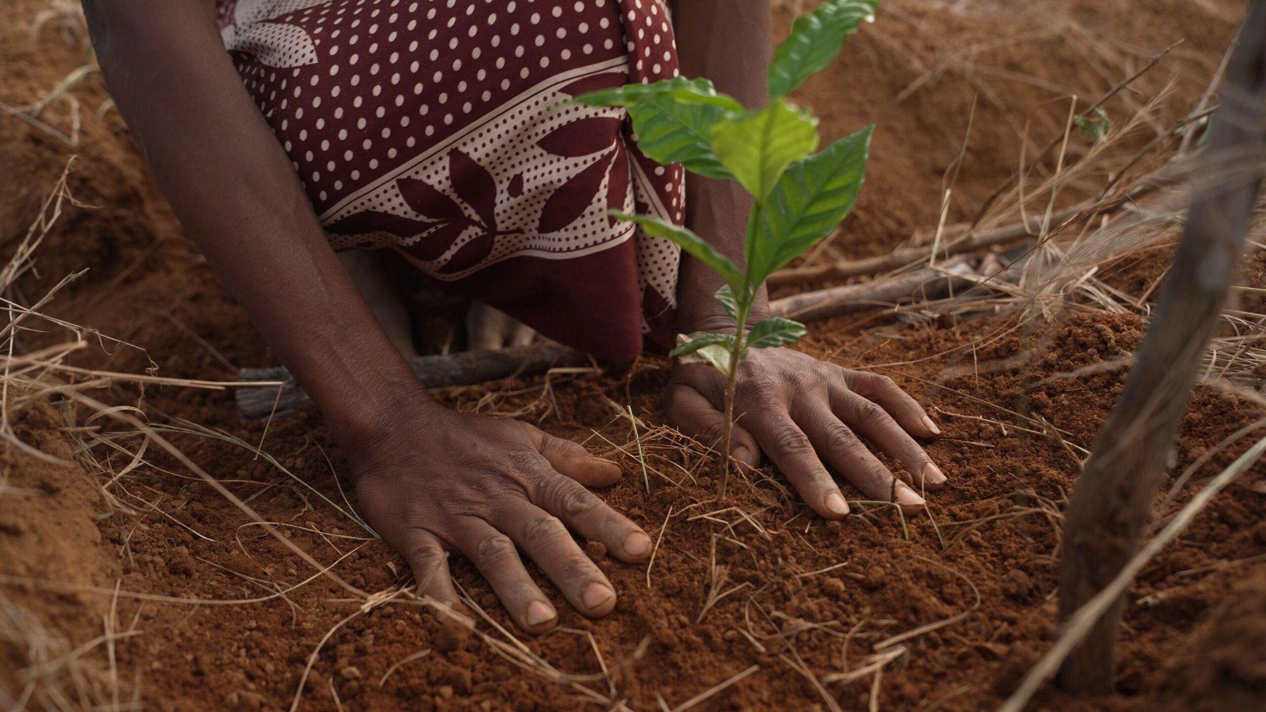 Women farmers, led by Ernestine Razafindravola (right), the head of the Soa Te Hivoatra Women’s Association, plant crops using adaptation techniques in Androy Village, East Madagascar. Photo credit: GCF/Little Big Films
