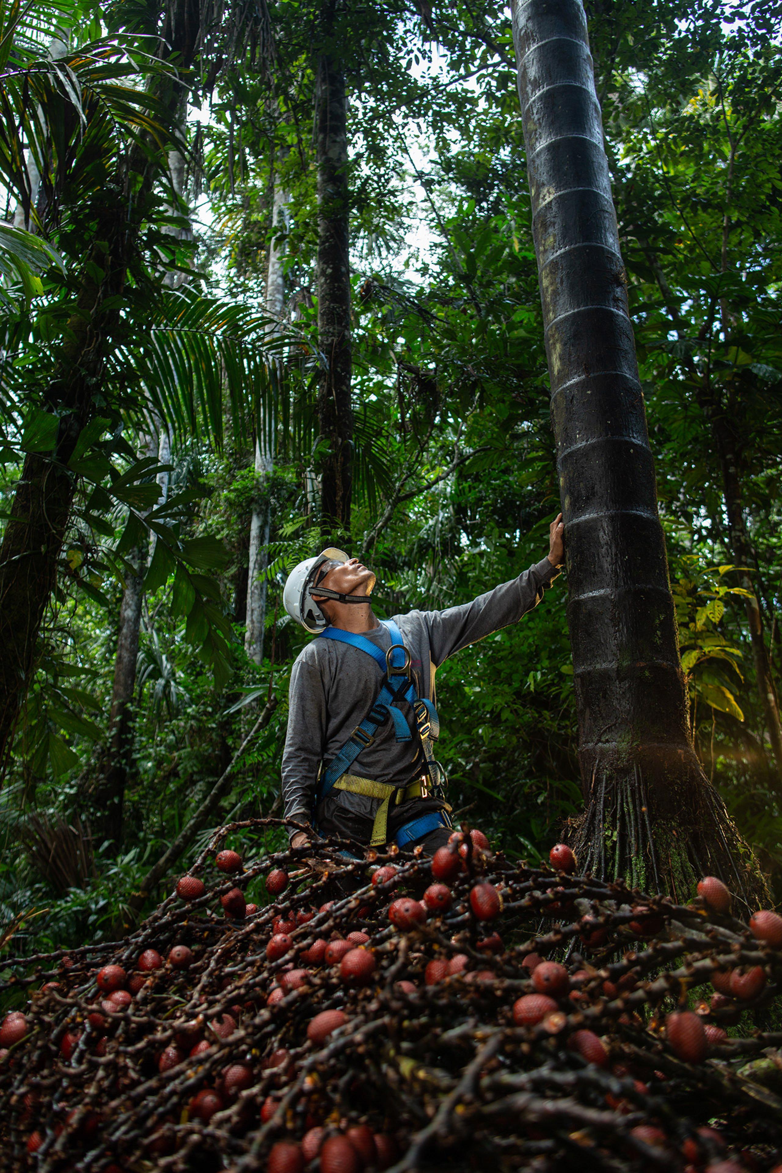 Segundo Chanchari, an aguaje palm tree escalation technician now uses safe, and internationally compliant climbing equipment to collect the fruit using a zero-waste approach. The technique allows Segundo and his community to harvest between 20 and 30 aguaje palm trees per day.